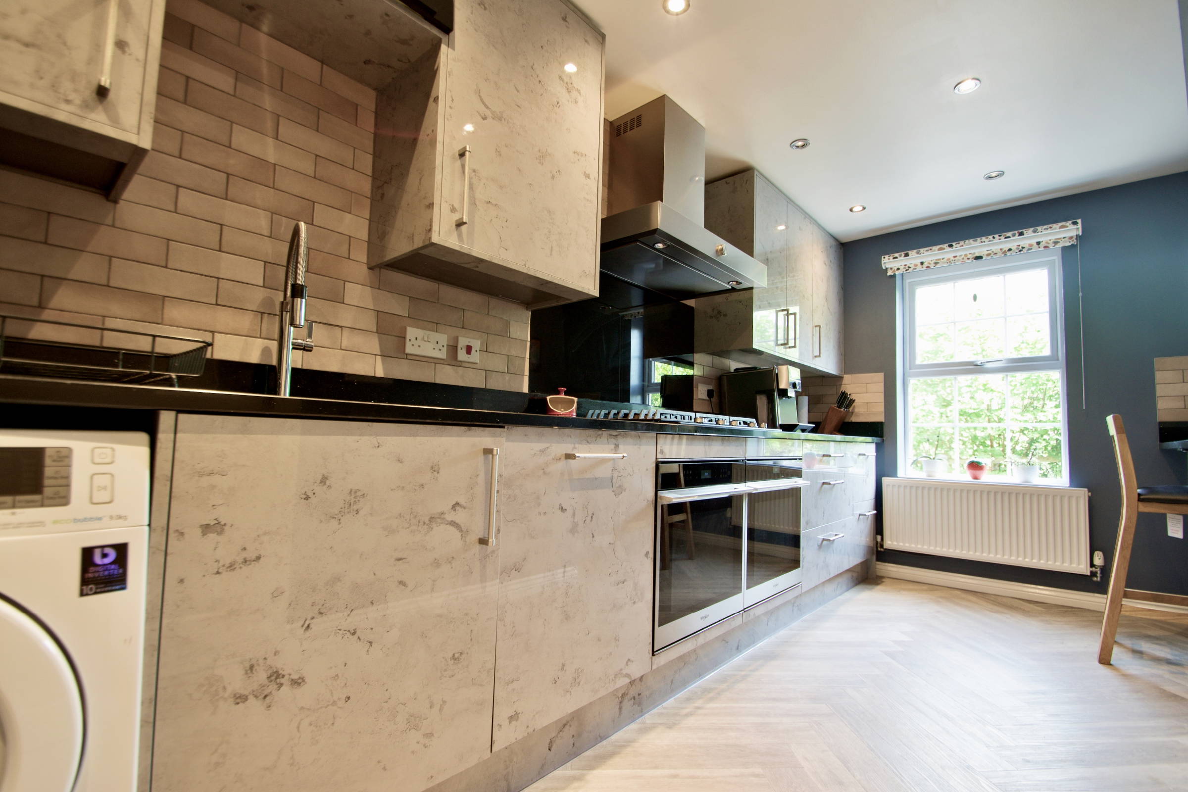 Heavily upgraded by the current owners containing base eye level gloss units with fitted double oven and handy breakfast bar.
