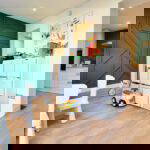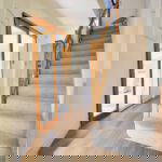 A spacious contemporary hallway with additional porch entry, understairs storage, light and bespoke glass panelled balustrade, and entry into the lounge and kitchen diner.